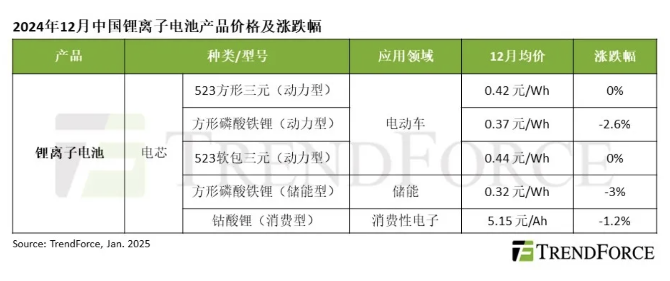 1月13日,根据TrendForce集邦咨询最新调查,2024年中国动力及储能电芯价格历经长期下跌后,至第四季跌幅收敛。随着2025年全球电动汽车及储能市场需求预期好转,供应商涨价减亏诉求强烈,有望支撑2025年第一季磷酸铁锂、锂电铜箔和电解液等电池原料价格,进而稳定电芯均价。