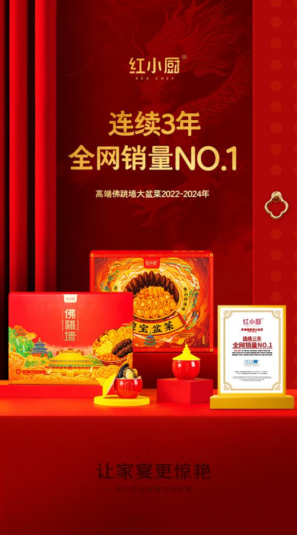 据权威市调机构数据显示,红小厨位居2024年高端佛跳墙大盆菜全网销量NO.1,实现连续三年领跑行业,成为国内“御膳美食”市场首个销量“三连冠”的品牌。