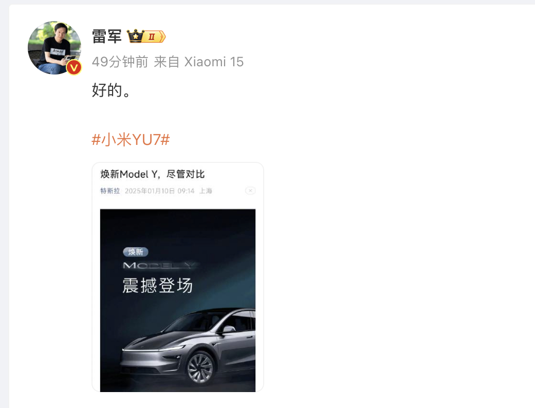 1月10日,雷军转发了特斯拉Model Y发布的题为“焕新ModelY,尽管对比”的宣传文章,并配文“好的”,还带上了小米已经官宣但尚未发布的SUV新车YU7的话题,这也显然是对YU7的产品力,有绝对的自信。