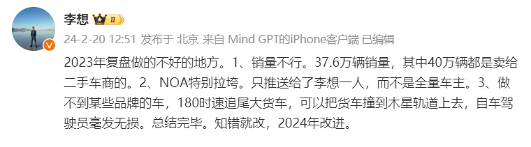 之后,李想在针对2023年销量的复盘文章中,使用反讽的方法对“二手车商卖车”、“理想汽车NOA逊色”、“理想汽车车辆安全问题不如友商”进行了阴阳怪气的回应。