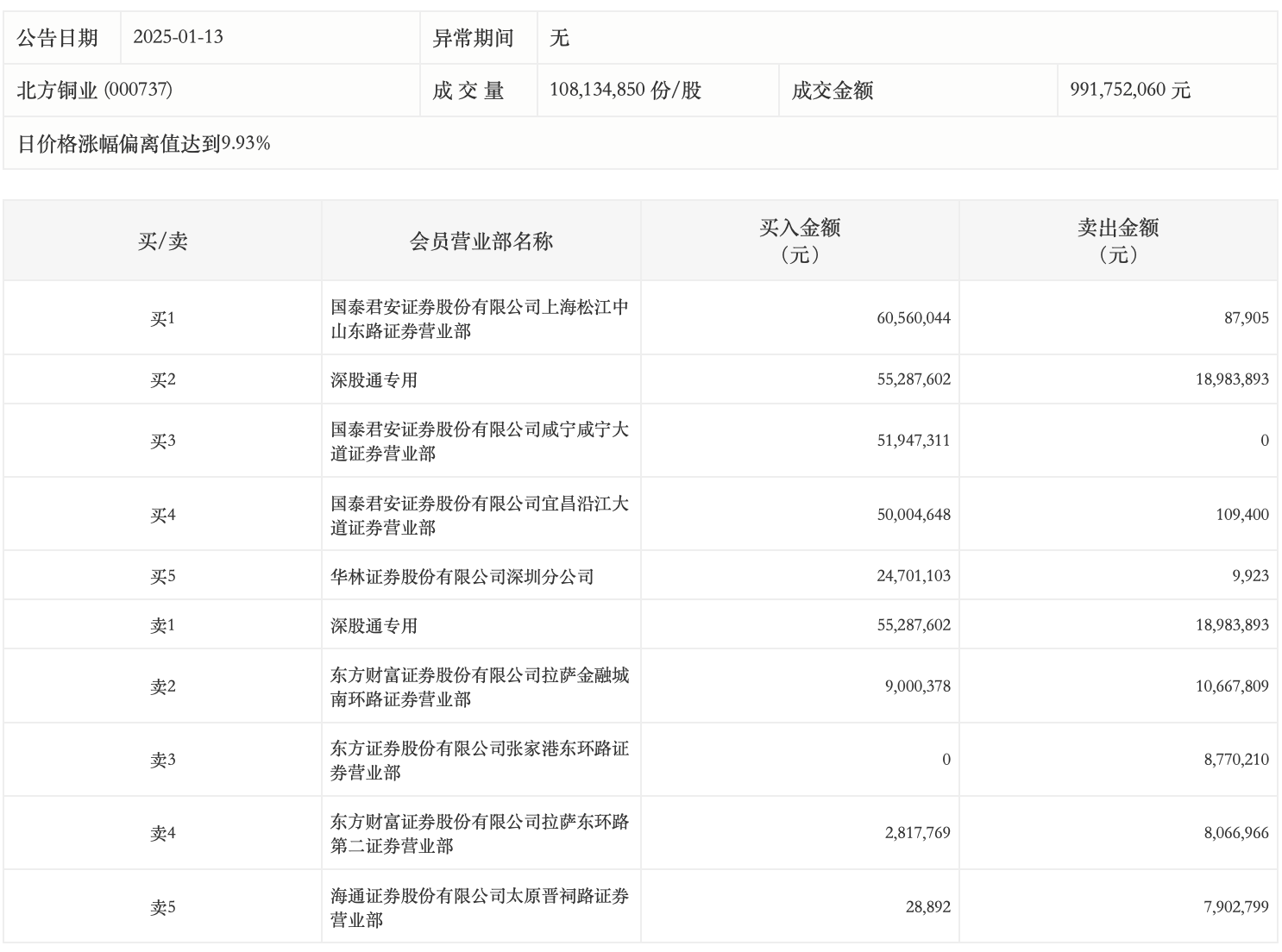1月13日,北方铜业今日涨停,龙虎榜数据显示,上榜营业部席位全天成交3.09亿元,占当日总成交金额比例为31.15%。其中,买入金额为2.54亿元,卖出金额为5459.89万元,合计净买入2亿元。