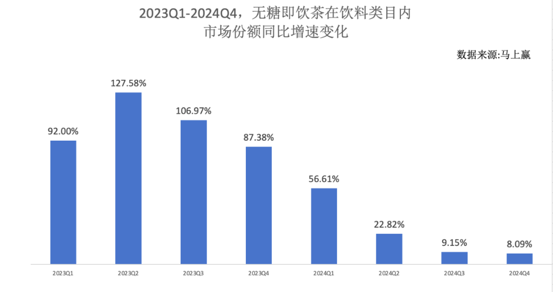 小食代从快消品线下监测网络“马上赢”处拿到的数据显示,从2023年第一季度到2024年第四季度,无糖即饮茶在饮料市场所占份额的同比增速明显放缓,2023年的每季同比增速最高一度超过127%,最低也有约87%。但到2024年,同比增速逐季放缓,由一季度的56.61%滑落至四季度的8.09%。