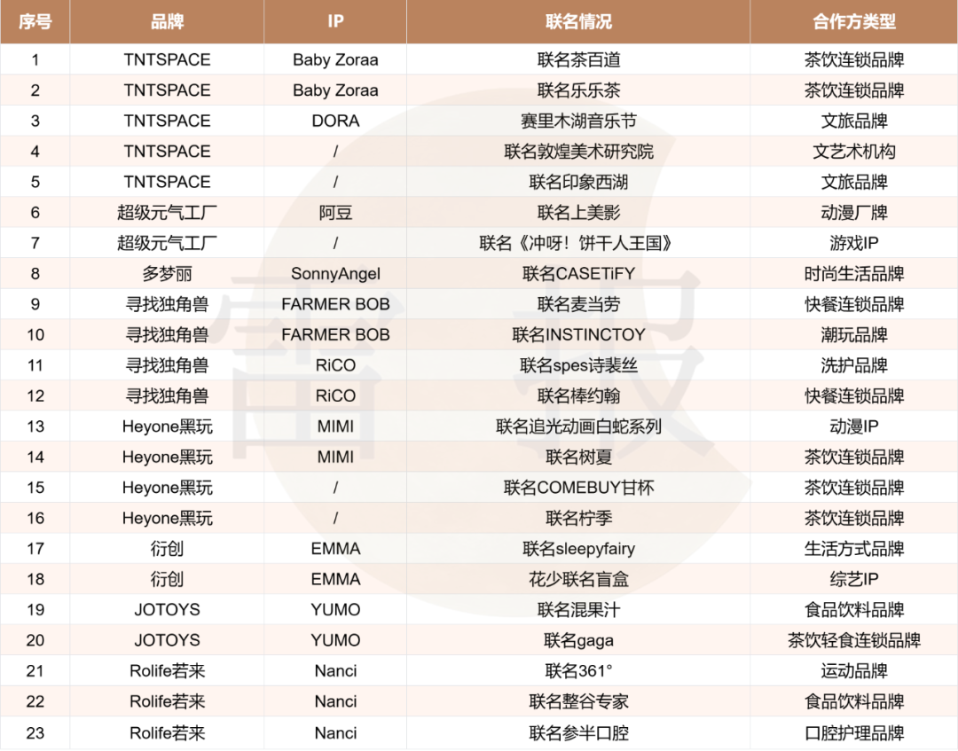 寻找独角兽和Heyone黑玩均有4起IP联名事件。其中,寻找独角兽的FARMER BOB和RiCO各有两起IP联名事件,包括FARMER BOB联名麦当劳、RiCO 联名棒约翰等。Heyone黑玩的联名事件中有两起来自MIMI,分别是与追光动画的白蛇系列和茶饮品牌树夏,另外两起则同样是品牌旗下IP的整合打包联名。Rolife若来的Nanci有3起联名,分别是与运动品牌361°、食品饮料品牌整谷专家以及口腔护理品牌参半口腔。其余品牌的IP联名事件则仅有一起或两起。具体情况如下: