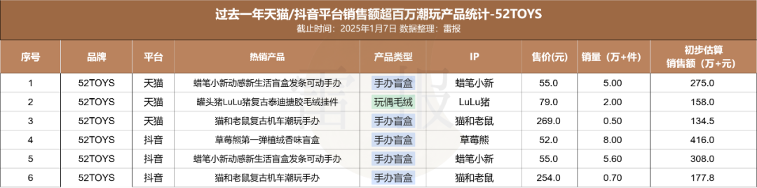 52TOYS上榜了两个IP分别是LuLu猪和NOOK。作为一家以授权IP潮玩为核心品类的公司,52TOYS的热销款一向是大热影视动漫IP的盲盒系列。例如,在雷报统计中,过去一年52TOYS共有6款单平台百万销售额的爆款产品,其中5款都是来自热门动漫IP,分别是两款猫和老鼠、两款蜡笔小新和一款草莓熊。而潮玩IP中,由毛毡艺术家Cici创作的LuLu猪市场表现最好,52TOYS的旗舰店中该IP有多款产品销售表现良好,尤其是复古泰迪搪胶毛绒挂件,其在天猫旗舰店的销售额超158万元。
