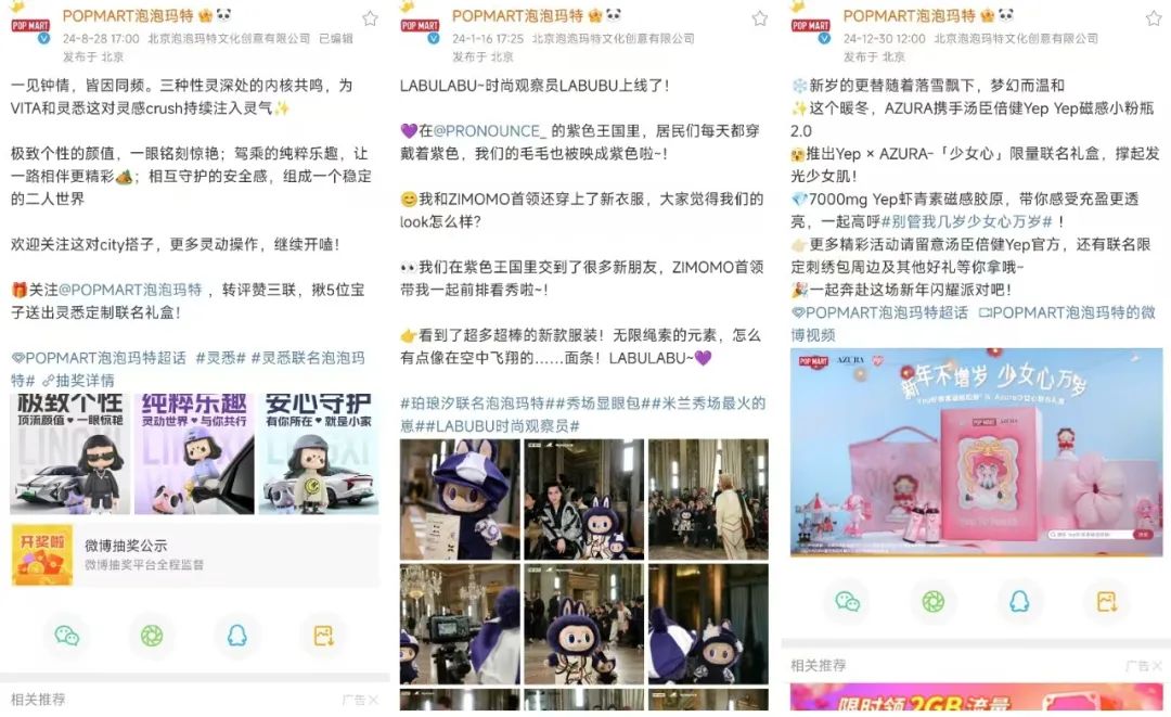 此外,即便IP本身知名度一般,但由于背靠泡泡玛特这一平台背景,不少合作方同样会与尽管相对小众但调性更为契合的IP合作,例如与AZURA联名的汤臣倍健、与VITA联名的东风本田灵悉等等。