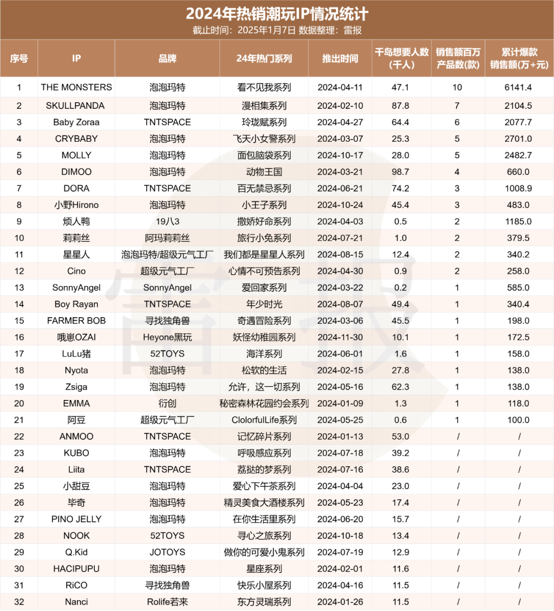 首先,本文结合上篇文章中的222个爆款、千岛平台潮玩系列的想要人数和相关网络资料,整理了业内过去一年热销的32个潮玩IP,名单如下:(注:由于部分热销产品售罄下架或其他原因无法统计,因而爆款产品数及销售额仅供参考)