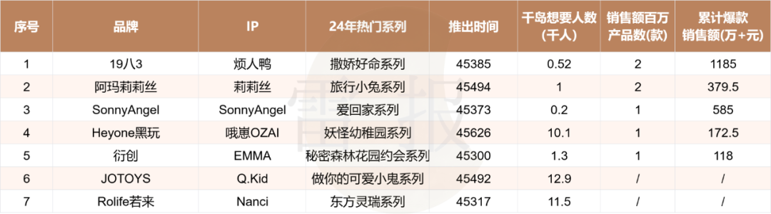 其余7个品牌均各有1个IP入榜,包括19八3 的烦人鸭、阿玛莉莉丝的莉莉丝SonnyAngel、Heyone黑玩的哦崽OZAI、衍创的EMMA、JOTOYS的Q.Kid、Rolife若来的Nanci。
