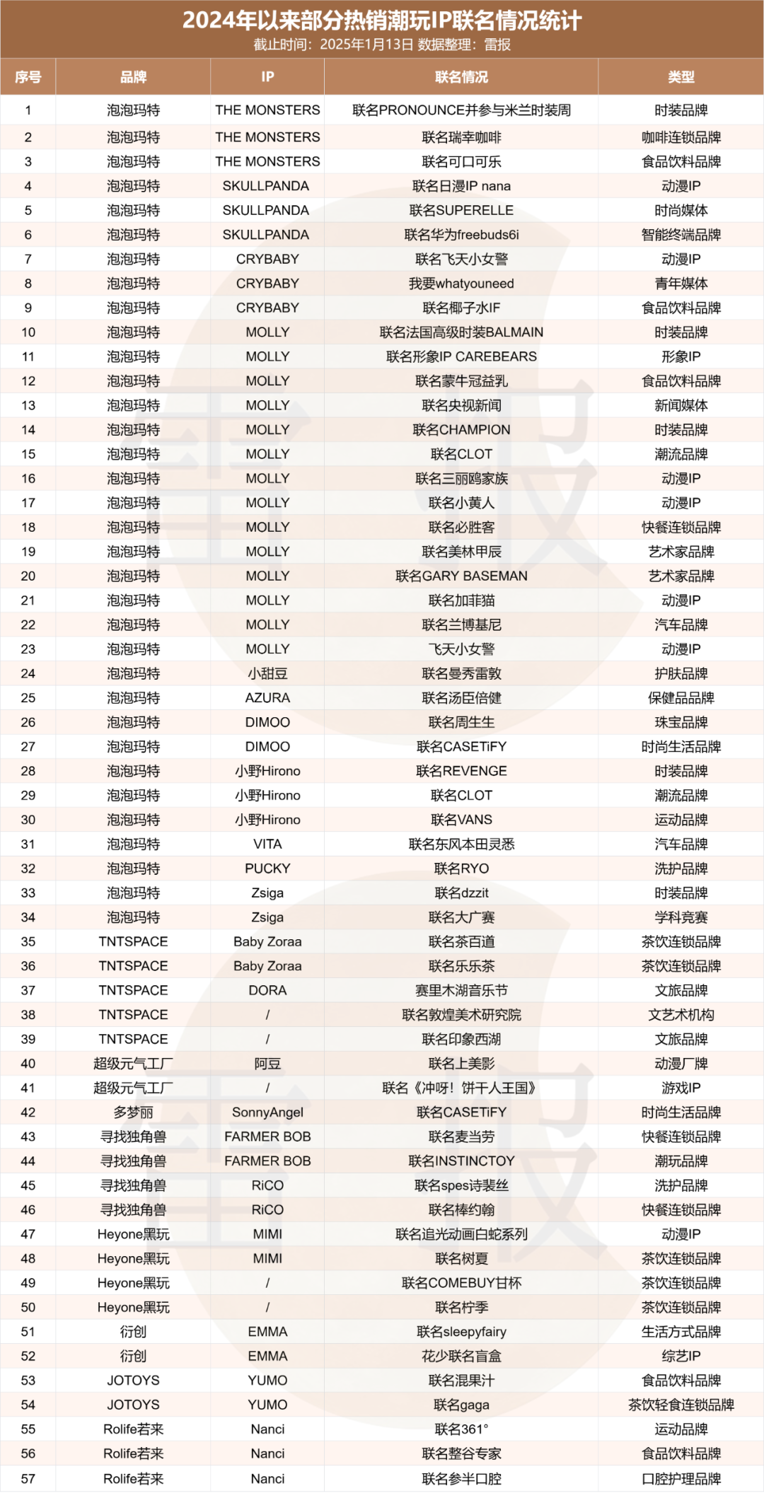不过,在当下的潮玩赛道中,这样的IP并不算多。雷报以上述32个热销潮玩IP及其所属12个潮玩品牌为范围在互联网平台进行检索,统计发现过去一年至少有57起潮玩IP联名合作事件(人工统计存在误差),名单如下: