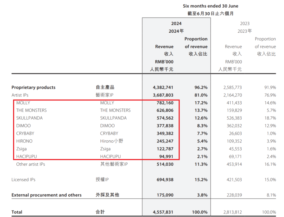 泡泡玛特此前发布的中期报告显示,仅2024年上半年,泡泡玛特旗下便有8个IP的收入超过9000万元,累计收入高达31.74亿元,占上半年泡泡玛特总收入的70%。