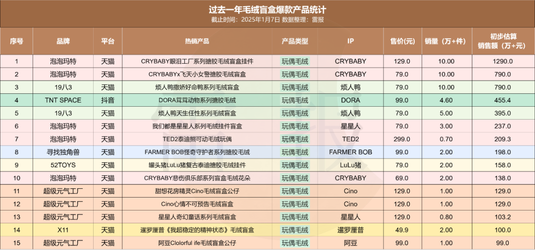 本期推文,雷报将聚焦潮玩行业中以盲盒(涵盖手办/毛绒/萌粒等)为核心品类的相关品牌,并从行业头部IP格局、潮玩IP联名两方面出发,进一步梳理分析过去一年国内潮玩行业的发展境况及未来趋势。