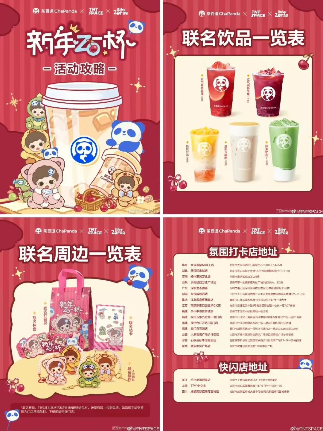 TNTSPACE的IP联名次数同样排在第二位,共计5起联名事件,包括乐乐茶x Baby Zoraa、茶百道x Baby Zoraa这两起茶饮品牌联名事件,以及与DORA合作的赛里木湖音乐节。其中,与茶百道的合作中在全国打造了15家氛围店和3家快闪店,并在活动期间通过集卡抽奖的方式推动Baby Zoraa的首款毛绒盲盒。