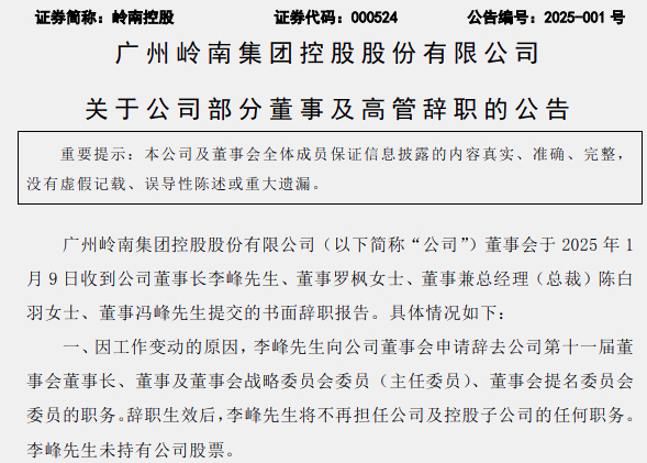 2024年3月,李云履新首旅酒店董事长,原董事长白凡因工作变动辞职;2024年6月,锦江酒店沈莉因年龄原因辞去首席执行官职务,聘任毛啸接任;2024年10月,西安旅游总经理庄莹因工作变动辞职。2024年12月,西安旅游董事长王伟同样因为工作原因辞职;今年1月,岭南控股董事长李峰、董事罗枫、董事兼总经理(总裁)陈白羽、董事冯峰等4人共同提交辞职报告。