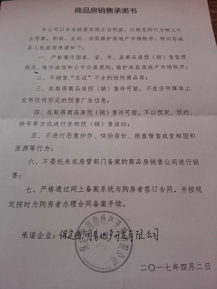 承诺书的内容主要有:一是严格遵守国家、省、市、县商品房预(销)售管理规定,维护容城县房地产市场秩序;二是不销售“五证”不全的任何商品房;三是在取得商品房预(销)售许可前,不在任何媒体上发布任何形式的预售广告信息,不以预定、预约、排号等方式进行变相预(销)售活动;