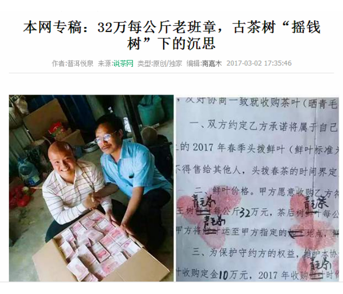 背景一:2017年3月初,关于2017年,老班章茶王树成交价32万元/kg的消息,开始在网络上漫天飞扬。传言说这棵老班章茶王树头春茶是被来自山东的一个土豪,直接拎着一箱人民币,提前支付了“包采”费用。