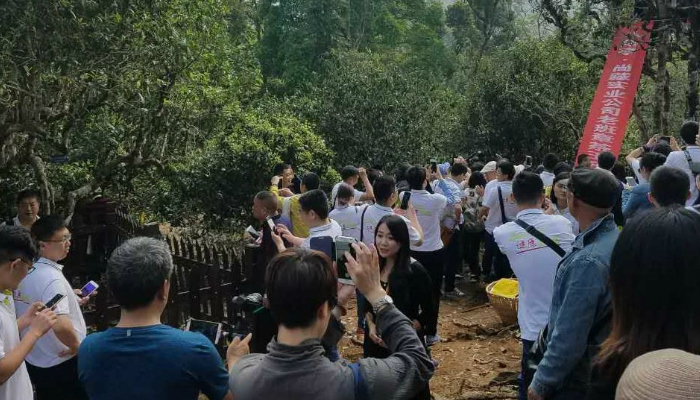 2017年3月30日,老班章茶王树开采仪式启动。各种直播航拍,各种长枪短炮,各种照相机手机齐拍,“茶王树”共人群普天同庆。当时,茶语的直播团队和春茶播报团队都在老班章现场(扫描下图二维码,即可回看茶语网东方生活美学“一直播现场直播”),但是仍然是无法接近茶王树核心区域以及后期炒制现场,大量的穿着同款白色服装的团队将现场保护得水泄不通。