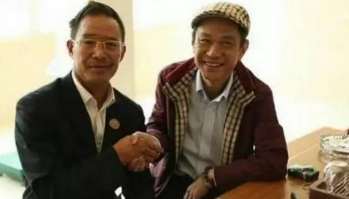 这是3月2日,杨尚燃(右)接受采访时和老班章“茶王树”主人杨永平(左)合影。
