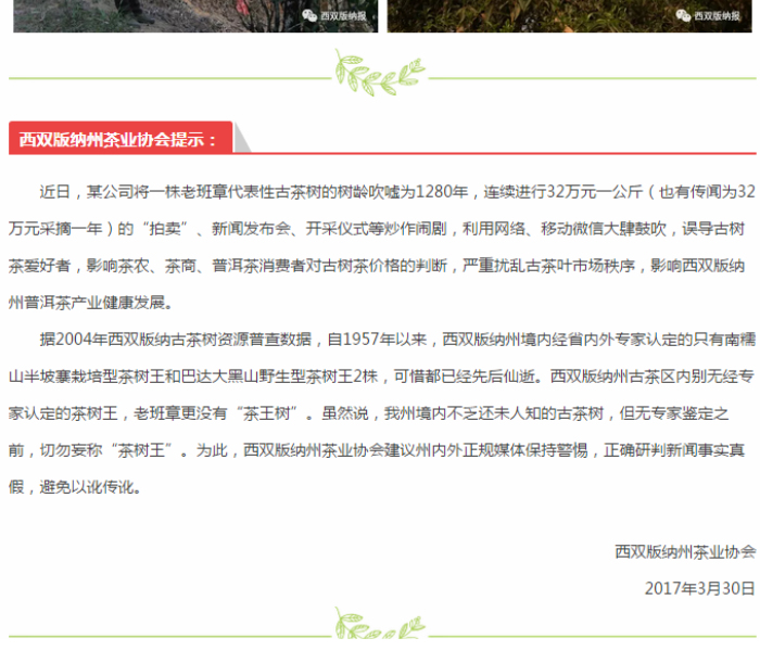 背景四:2017年3月31日,西双版纳茶业协会一篇名为《32万一公斤老班章茶树王春茶系商家刻意炒作》的声明,把整个事件推上了高潮。
