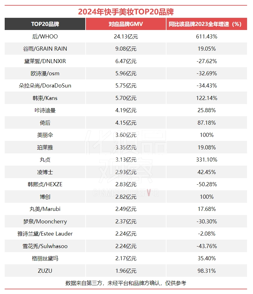2024年全年,后WHOO在快手上的GMV超24亿元,同比增速超600%,与第二名拉开超10亿差距。其中,双十一期间的10月19日,辛巴单场直播便为后WHOO带来超16亿GMV。