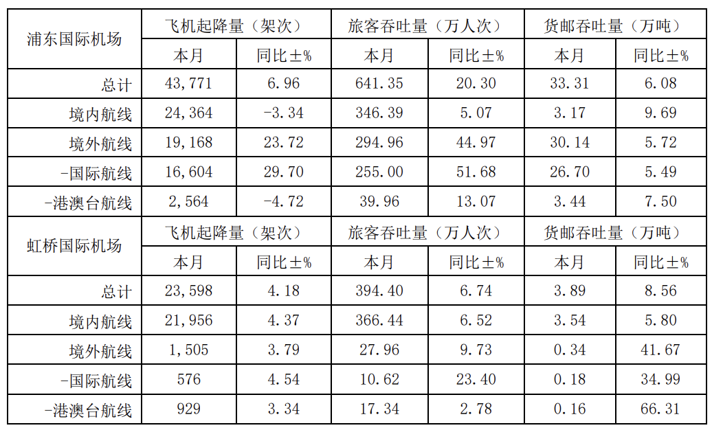 虹桥国际机场飞机起降量总计2.36万架次,同比增长4.18%;旅客吞吐量394.40万人次,同比增长6.74%;货邮吞吐量3.89万吨,同比增长8.56%。