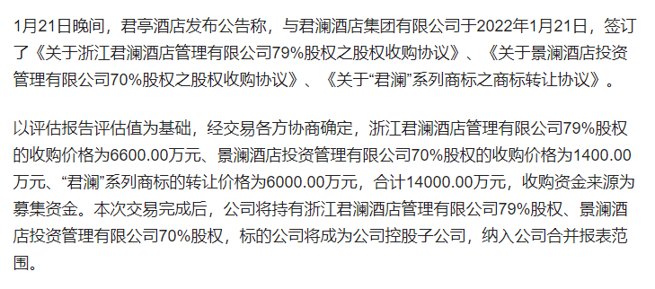 君亭酒店也老早就明白这件事了。其在2021年IPO募集了2.2亿资金用于扩张直营店,但2022年突然改变资金用途,将其用于收购君澜、景澜两家公司,耗资1.4亿。