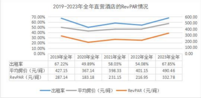 2019年——2023年,直营店全年平均ADR416.8元,平均OCC 59.4%,平均RevPAR250.24元。