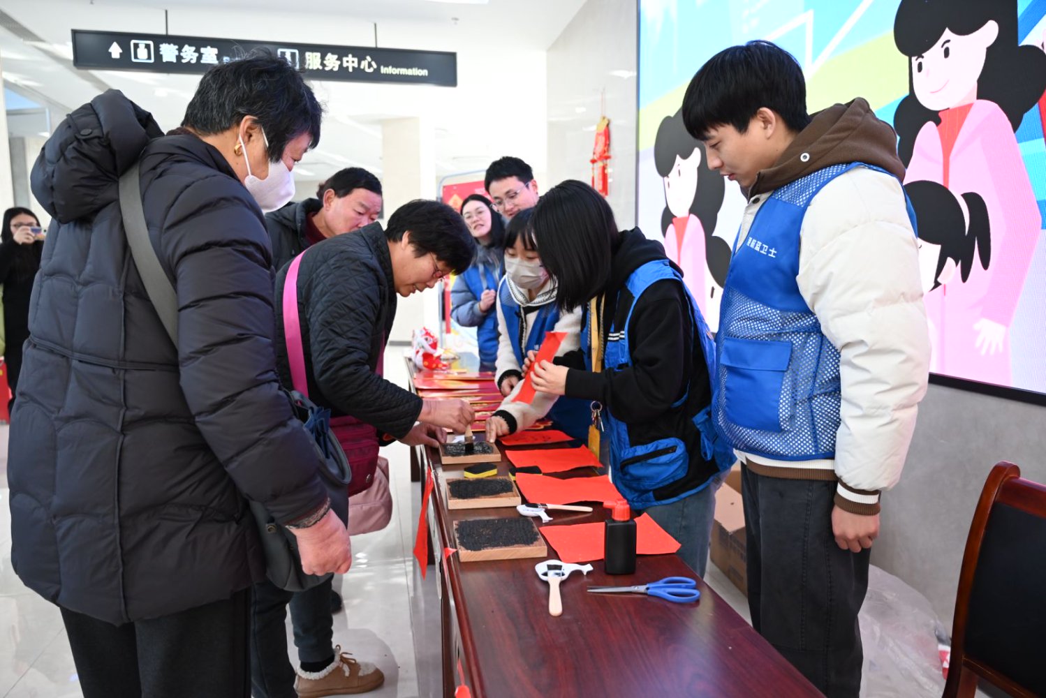候船大厅里, 青年志愿者邀请旅客参加非遗文化活动——木雕印福。不少旅客驻足停留,亲手制作了一张张福气满满的创意福字,并将满满的“福气”带回了家。一张张欢欣雀跃的笑脸被主播的镜头记录了下来,通过小小的屏幕,传递到了五湖四海,感受着同一份归家的喜悦。
