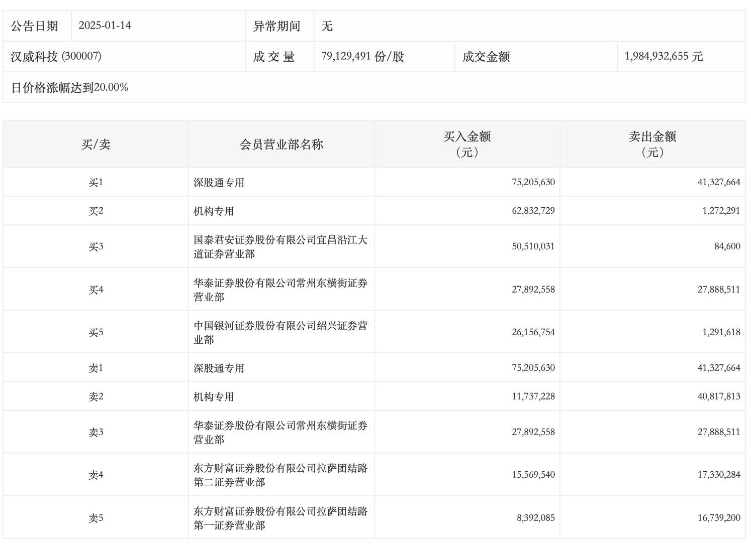 1月14日,汉威科技今日涨停,龙虎榜数据显示,上榜营业部席位全天成交4.25亿元,占当日总成交金额比例为21.41%。其中,买入金额为2.78亿元,卖出金额为1.47亿元,合计净买入1.32亿元。