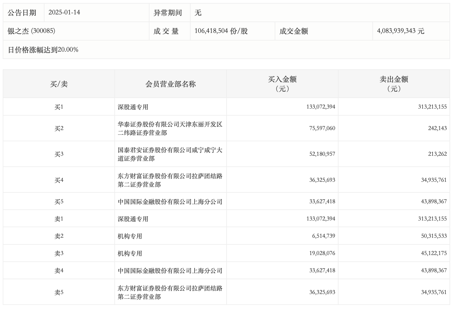 1月14日,银之杰今日涨停,龙虎榜数据显示,上榜营业部席位全天成交8.44亿元,占当日总成交金额比例为20.67%。其中,买入金额为3.56亿元,卖出金额为4.88亿元,合计净卖出1.32亿元。