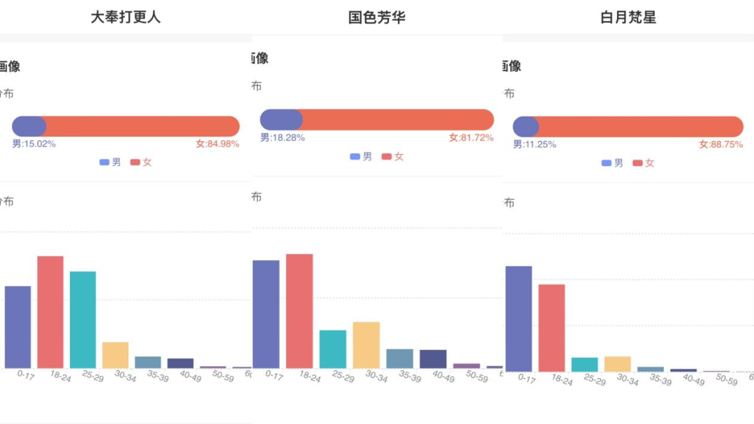 更为尴尬的是,艺恩数据显示,时至当下,《大奉打更人》的男性观众群还没有入场,用户性别和年龄分布的集中区域与两部女频剧《国色芳华》《白月梵星》高度重合。