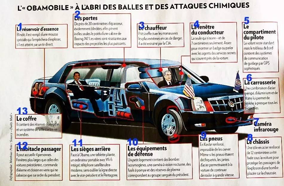 到了奥巴马时期,总统座驾已经全面“进化成功”。奥巴马的座驾叫凯迪拉克一号(Cadillac One)。出于安全考虑,它的大部分细节属于机密。已知的装备有设置在车身某个秘密位置的特殊夜视系统,常见的车门门把则由特殊的环状装置所取代,当车刚启动时,特工会紧握该门把跟跑一段距离,这是为了在车速较慢时能够快速反应。该车能全身防弹自不必讲,固特异的防爆轮胎也不容易被毁坏。为防生化攻击,全车可完全密闭,有独立的供氧系统,后车厢内则置有与总统血型一致的血库,真可谓是全幅武装。
