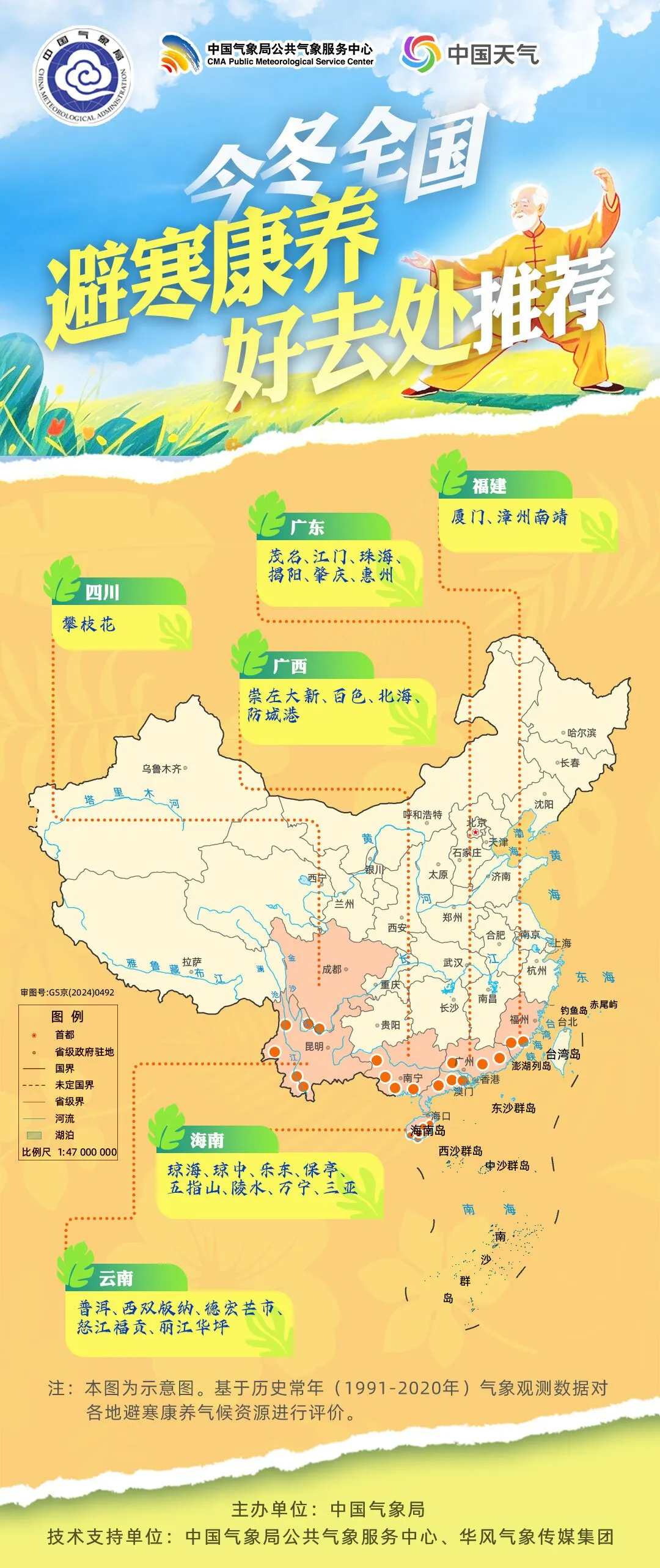1月15日,2025年全国春节文化和旅游消费月活动在吉林启动。在启动仪式上,中国气象局与文化和旅游部联合推出10条全国冰雪旅游路线和26个今冬避寒康养好去处。10条全国冰雪旅游路线涵盖南北、贯通东西,分别为“北疆风情·梦幻雪都”“筑梦亚冬会·北国好风光”“林海雪原·极寒挑战”“冰雪穿越·冷极探险”“长白粉雪·雾凇奇缘”“欢乐冰雪·温情之旅”“冬奥之城·滑雪嬉冰”“齐鲁冰雪休闲之旅”“冰雪温泉·探秘秦岭”“冰川秘境·雪山奇观”。26个“今冬避寒康养好去处”包括云南普洱、四川攀枝花、广东茂名、广西北海、海南乐东、福建厦门等地。