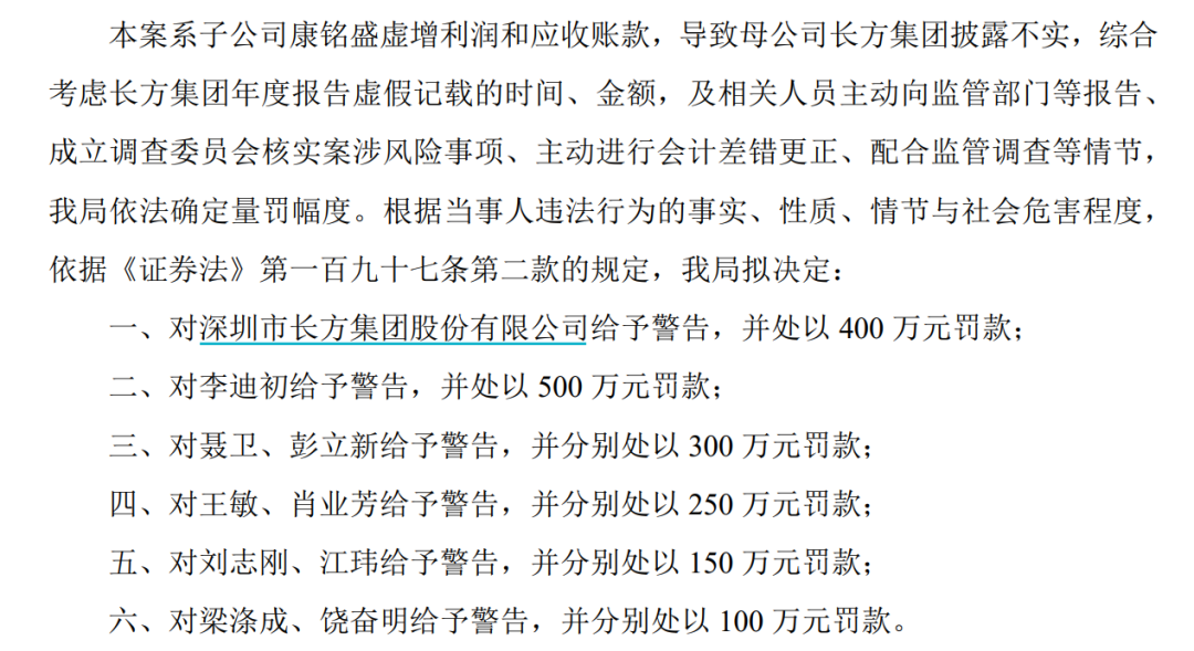 由于,康铭盛上述行为导致*ST长方披露的2020年、2021年年度报告存在虚假记载,涉嫌信息披露违法违规。深圳证监局对*ST长方及9名责任人拟给予其警告,并分别处以100万元至500万元不等的罚款,共计2500万元。其中,对*ST长方处以400万元罚款,对李迪初处以500万元罚款。