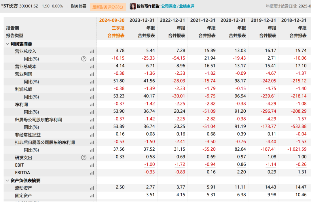 *ST长方业绩虽然同比有所增长,但仍未扭亏。2023年,*ST长方营收5.44亿元,同比下降25.33%;净利润亏损1.42亿元,同比增长36.74%;2024年前三季度,*ST长方营收3.78亿元,同比下降16.15%;净利润亏损0.37亿元,同比增长53.9%