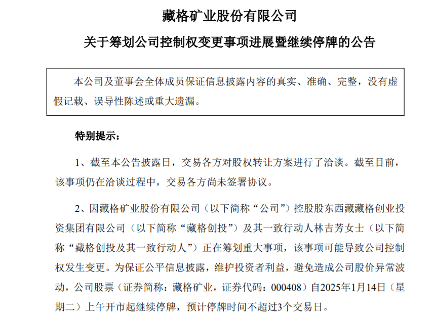 1月9日,据藏格矿业(000408.SZ)公告,控股股东藏格创投及其一致行动人林吉芳、第二大股东新沙鸿运投资,分别计划转让17.51%、7.21%的股份,接盘者为陈景河掌控的紫金矿业。