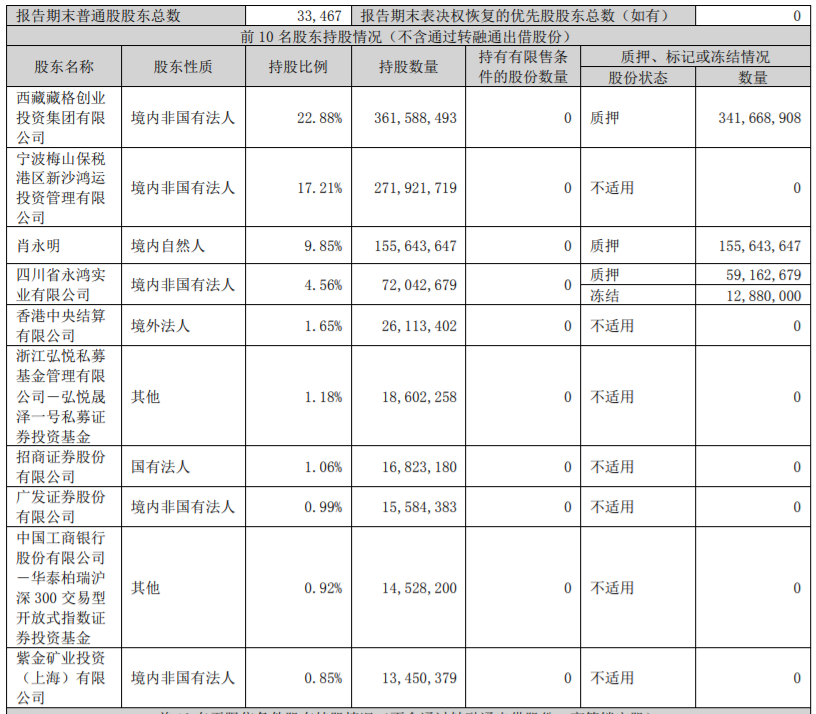 2024年三季报显示,藏格集团所持藏格矿业的股权质押率为94.49%,肖永明则将所持股份全部质押,永鸿实业的质押率为82.12%,还有部分股权被冻结。