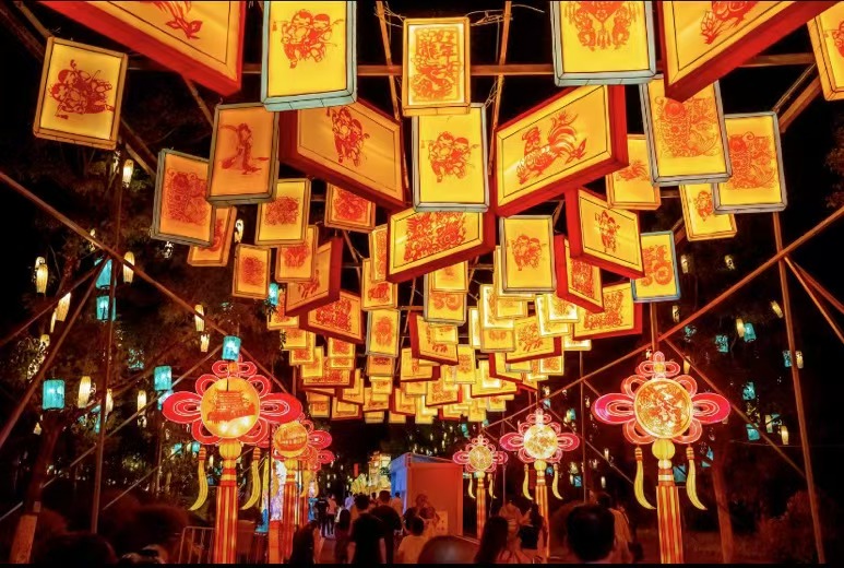 【一长廊】以“古今名人敬往昔”、“非遗剪纸文化”以及“山海奇珍”三个系列主题灯组组成特色鲜明的文化长廊。