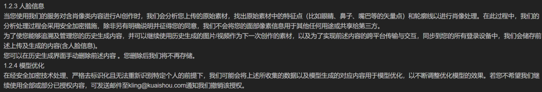 可灵作为视频及图像生成平台,在人脸使用方面有着重表示,称不会将您的面部像素信息用于其他任何用途或共享给第三方。但如果想要取消授权,则需要发送邮件联系官方进行取消。
