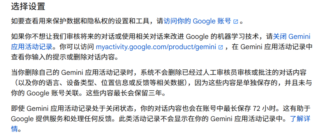 另外,Gemini也提到,当删除自己的应用活动记录时,系统不会删除已经过人工审核员审核或批注的对话内容(以及语言、设备类型、位置信息或反馈等相关数据),因为这些内容是单独保存的,并且未与Google账号关联。这些内容最长会保留三年。