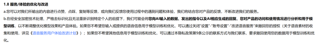 而这些产品的说法也基本一致,“为了优化和改进服务体验,我们可能会结合用户对输出内容的反馈以及使用过程中遇到的问题来改进服务。在经过安全加密技术处理、严格去标识化的前提下,可能会将用户向AI输入的数据、发出的指令以及AI相应生成的回复、用户对产品的访问和使用情况进行分析并用于模型训练。”