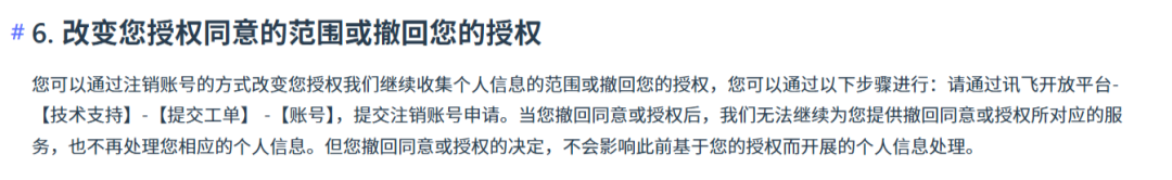 相比豆包、通义千文以及可灵,讯飞星火的要求更为苛刻,按照条款,用户如果需要改变或撤回收集个人信息的范围,需要通过注销账号的方式才能实现。