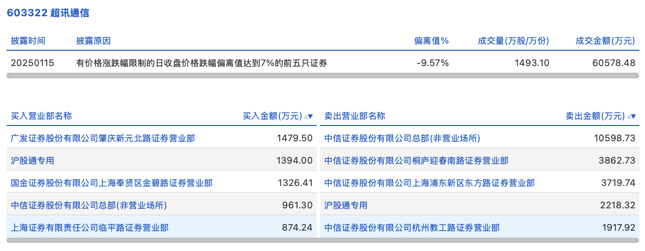 1月15日,超讯通信今日跌停,龙虎榜数据显示,上榜营业部席位全天成交2.84亿元,占当日总成交金额比例为46.8%。其中,买入金额为6035.45万元,卖出金额为2.23亿元,合计净卖出1.63亿元。