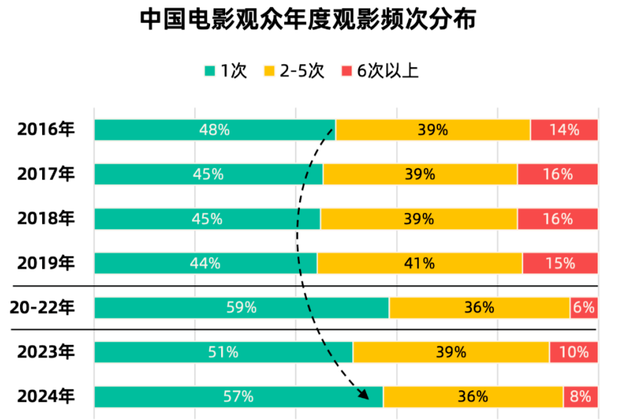 更细微的数据还在于,57%观众全年只观影一次、81%影院年票房不足500万、年轻观众占比降至21%,寻找增量、拯救影院生存、留住年轻人等问题不断盘旋在每个电影从业者头顶。