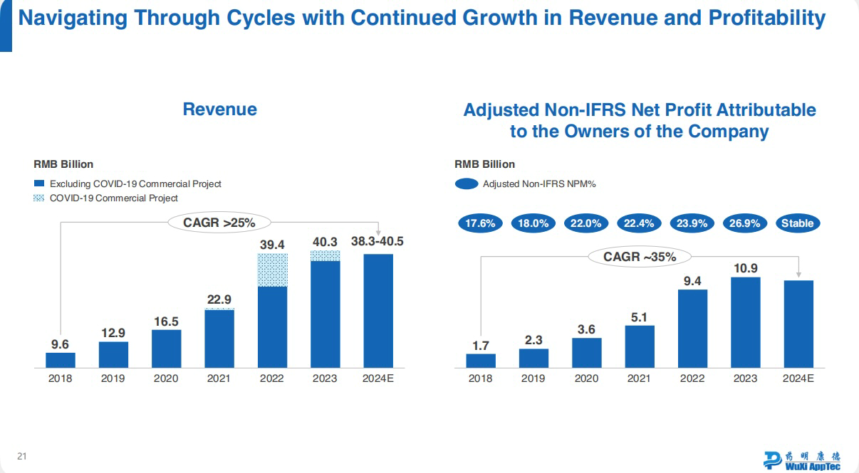 药明康德在JPM大会上透露,尽管行业整体利润下降,公司业绩指引有所下调,但其经调整non-IFRS净利润率自2018年的17.6%稳步增长至2023年的26.9%,预计2024年仍将保持较高利润率。