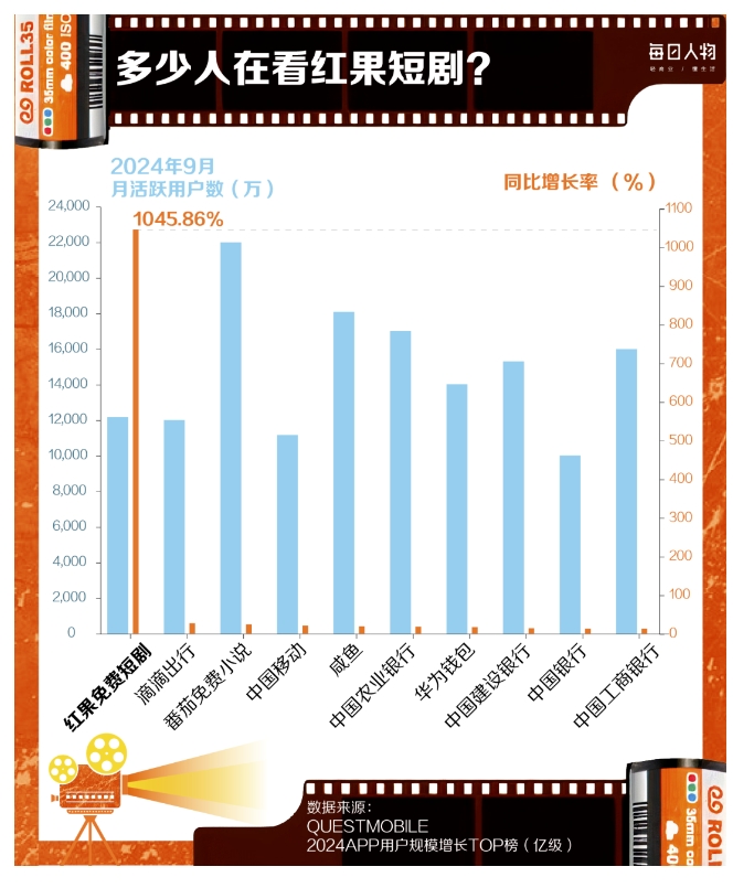 其中,把用短剧拉新推到极致的,依然是抖音集团。在扶持付费剧场的同时,还推出了一款免费看剧的独立App——红果短剧。去年9月,上线仅11个月的红果短剧,月活突破1.2亿(同比增长1045.86%),增长率超过滴滴出行、闲鱼等。