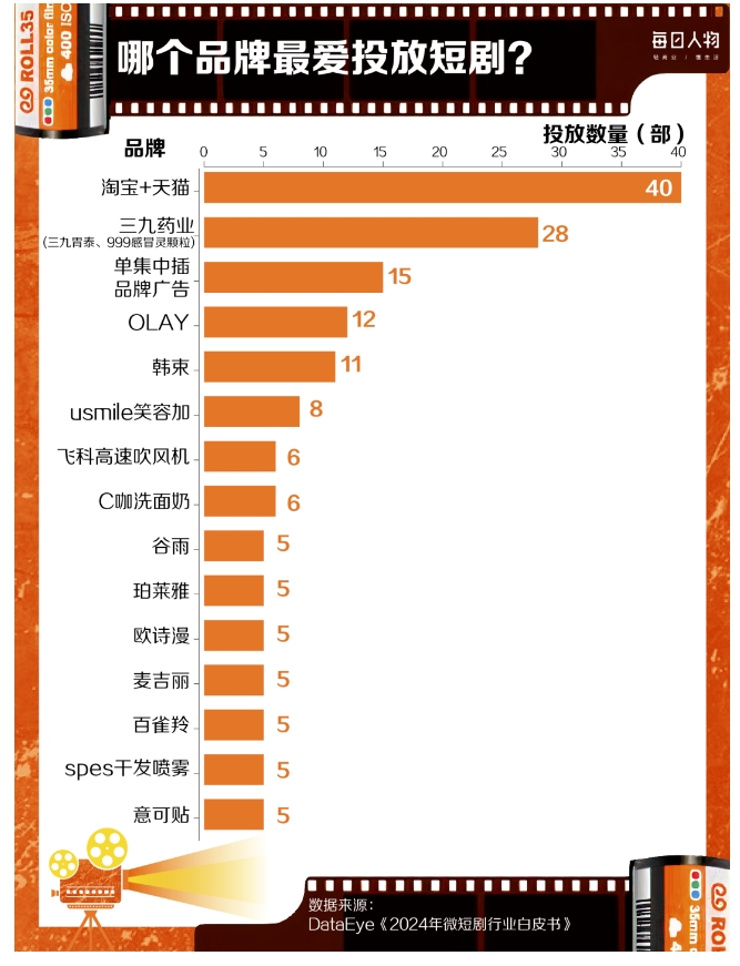 从品类上看,最爱投短剧的是美妆个护品牌。韩束、彩棠、丸美、倩碧、珀莱雅等频繁出现在各个短剧的赞助名单中。此外,药品类、生活品类品牌也在积极参与,去年一年,三九药业赞助了28部品牌短剧。