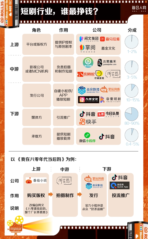 中游是制作者。影视公司或者MCN机构负责拍摄和制作短剧,流水分成大概为3-5%。