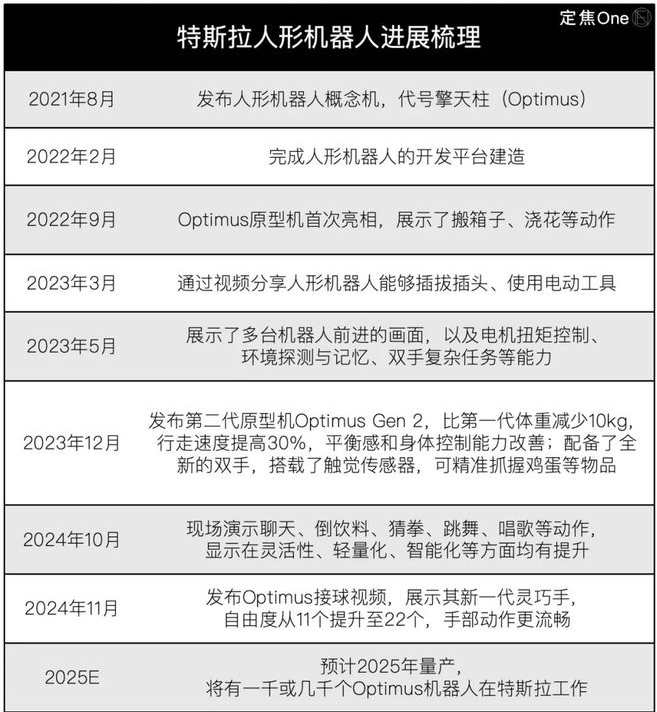 特斯拉是行业“先驱”,在过去两年完成了Optimus(擎天柱,特斯拉人形机器人代号)3个主要设计版本和4个手部版本的开发,并展示了家庭服务、工业生产方面的能力,预计2025年量产,2025年底或2026年投放市场。