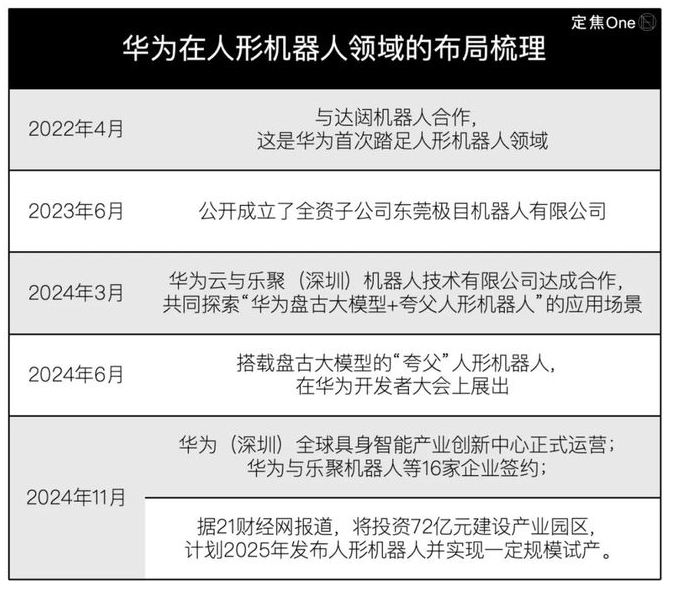 直到2024年11月,接连两则消息传出:华为(深圳)全球具身智能产业创新中心正式宣布启动运营,并与乐聚机器人等16家企业签约;另据21财经网报道,华为将投资72亿元建设产业园区,计划2025年发布人形机器人并实现一定规模试产。