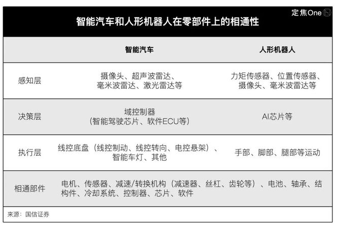 两者在电机、传感器、减速机构、电池、冷却系统、轴承、芯片等部件上是相通的。车企有深厚的硬件供应链资源,以及较强的成本管控能力、质量管控能力,因此在人形机器人零部件快速整合形成量产方案方面,有明显优势。