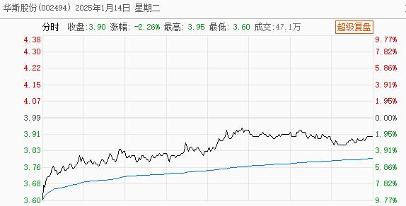消息公布后,华斯股份于1月14日大幅低开9.77%,逼近跌停,开盘后公司股价跌幅有所收窄,截至收盘,公司股价收报3.90元/股,全天下跌2.26%,换手率16.42%,成交量47.10万手,成交额1.79亿元。